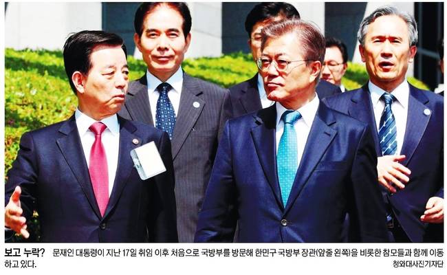 한겨레신문은 지난 17일 문재인 대통령이 취임 후 처음으로 서울 용산구 국방부를 방문했을 당시 한민구 국방부장관의 안내를 받아 합동참모본부로 이동하는 모습을 1면에 담았다. 한겨레는 관련기사에서 “문재인 대통령이 30일 사드 발사대 4기가 비밀리에 국내로 반입돼 경북 성주 부지 인근 미군기지에 보관 중인 사실을 확인하고 국방부의 보고누락경위 등에 대한 진상파악을 청와대 국가안보실과 민정수석실에 지시했다”고 게재했다. 이어 “국방부의 보고 누락을 묵과하기 힘든 국기문란 행위로 규정하고 있다는 의미로, 진상조사 결과에 따라 군과 국방부에 대한 강도 높은 인적 청산과 개혁 조치가 뒤따를 것이란 관측이 나온다”고 전했다.