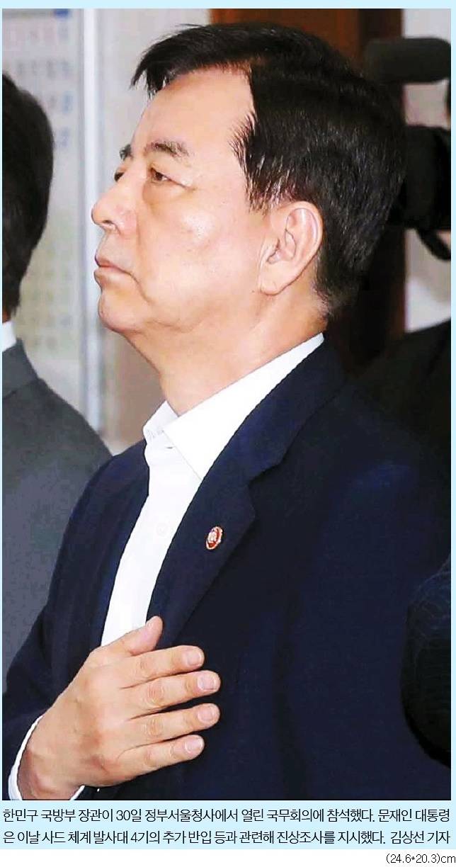 중앙은 한 국방부장관이 20일 정부서울청사에서 열린 국무회의에 참석한 모습을 1면 사진으로 선택했다. 중앙은 관련기사에서 “사드 1개 포대는 발사대 6기로 구성돼 있다. 국방부는 3월7일 2기의 도착 사실은 발표했다. 4기 추가 배치 사실은 지난달 언론보도를 통해 알려졌다. 국방부 관계자는 ‘국정기획자문위에는 비문 성격의 내용을 빼고 보고했으나 업무보고 다음날인 26일 위승호 국방정책실장이 정의용 안보실장에게 별도로 대면보고를 했다’고 말했다”고 보도했다. 중앙은 “국방부 반응이 알려지자 청와대 고위관계자는 춘추관을 찾아와 ‘26일 정의용 안보실장과 이상철·김기정 1·2차장에게 현안보고를 한건 맞다’면서도 ‘발사대 4기가 추가 배치됐다는 내용을 알 수 있을만한 단어나 구절, 아라비아 숫자 4는 없었다’고 부인했다”고 전했다.