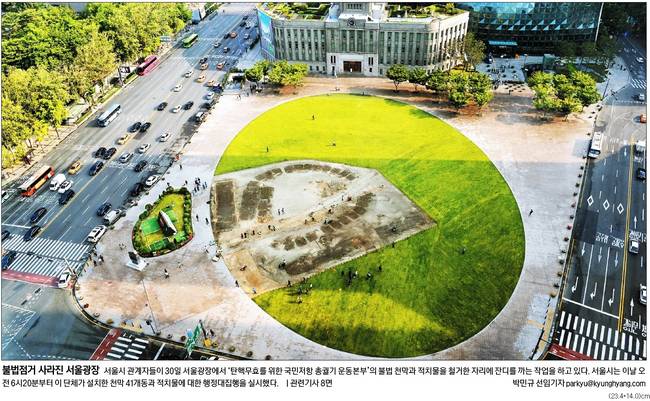 경향은 “박근혜 전 대통령의 탄핵 무효를 주장하는 단체가 서울광장에 설치한 농성장이 130일만에 모두 철거됐다”며 서울시의 행정대집행 실시 소식을 전했다. 행정대집행 후 해당 자리에는 곧장 잔디가 식자됐다고도 했다. 경향은 “무단점유를 이어가면서 서울광장에서 열리기로 돼 있던 33건의 행사가 취소, 연기되는 등 시민피해가 이어져 조치를 늦출 수 없었다고 시는 설명했다”고 게재했다.