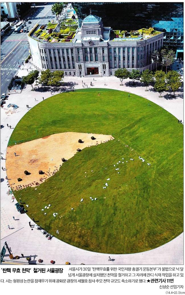 경향신문, 한국일보 등은 보수 단체의 천막이 철거된 서울광장의 모습을 1면에 담았다.