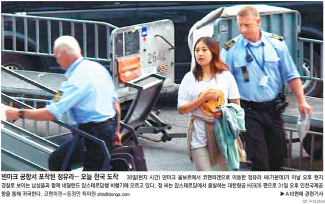 동아일보는 덴마크 공항에서 포착된 정유라 씨의 모습을 신문 전면에 배치했다. 그는 31일 오후 인천공항을 통해 귀국이 예정돼 있다. 동아는 관련기사에서 “최순실 씨의 딸 정유라 씨가 귀국길에 올랐다”며 “검찰 특별수사본부(특수본)는 정 씨를 인천공항 입국장에서 체포해 서울중앙지검으로 호송할 계획”이라고 전했다. 동아는 “특수본은 정 씨를 조사한 뒤 구속영장을 청구할 방침인 것으로 알려졌다”며 “최 씨의 조카 장시호 씨는 다음달 7일 1심 재판구속 기간이 만료돼 석방될 것으로 보인다”고 보도했다.