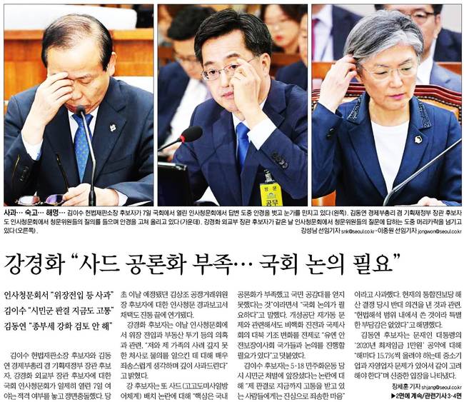 세계일보, 한국일보도 7일 서울 여의도 국회에서 김이수(왼쪽 사진부터) 헌법재판소장 후보자와 김동연 경제부총리 겸 기획재정부 장관 후보자, 강경화 외교부 장관 후보자에 대한 인사 청문회가 열린 가운데 세 후보자가 여야 의원들의 질문을 받으며 다양한 표정을 짓고 있는 모습을 담았다.
