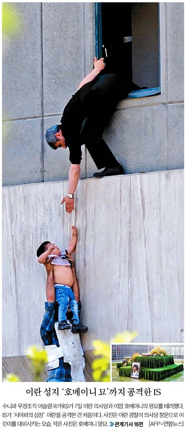 조선일보는 "이란 수도 테헤란의 의회 의사당과 이슬람 혁명을 주도한 호메이니 묘지에서 7일(현지 시각) 연쇄 총격‧자살 폭탄 테러나 일어나 최소 12명이 숨지고 40여명이 부상했다"며 "이슬람 시아파의 '맏형'인 이란의 정치적‧종교적 상징이 동시에 공격을 당한 것이다. 이란은 테러 직후 전국에 비상사태를 선포했다"고 전했다.