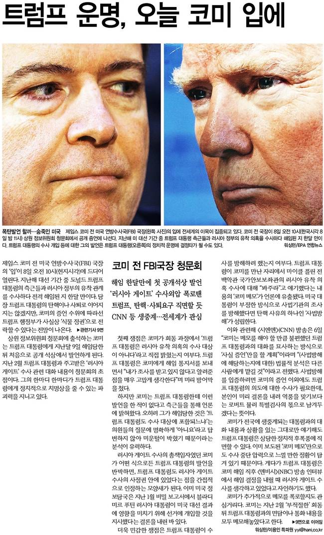 한겨레는 "당장 트럼프 대통령의 탄핵이나 사퇴로 이어지지는 않겠지만, 코미의 증언 수위에 따라선 트럼프 행정부가 사실상 '식물 정권'으로 전락할 수 있다는 전망이 나온다"고 전했다.