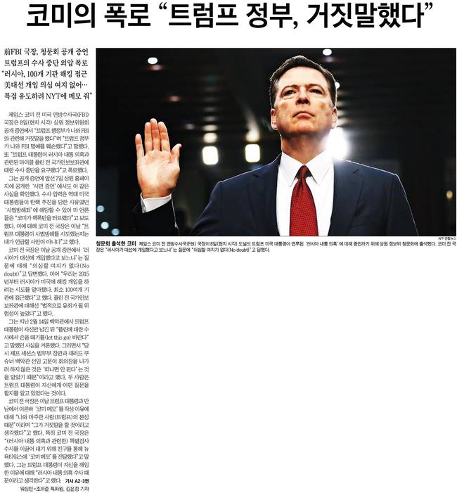 경향신문, 국민일보, 서울신문, 조선일보, 중앙일보 등 주요 종합일간지들은 9일자 1면 사진기사로 제임스 코미 전 미국 연방수사국(FBI)국장이 8일(현지시간) 워싱턴 의사당에서 열린 상원 정보위원회 청문회에 나와 도널드 트럼프 미국 대통령의 '러시아 스캔들' 수사 개입 의혹에 대해 증언하기 앞서 선서를 하고 있는 모습을 주요하게 다뤘다.