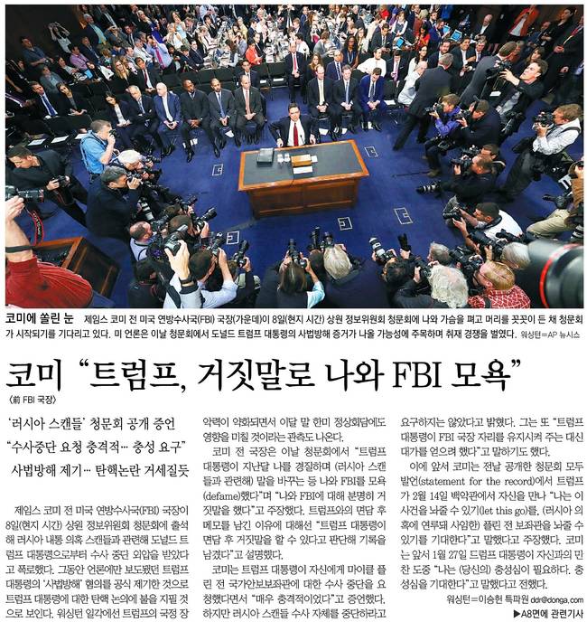 동아일보는 제임스 코미 전 미국 연방수사국(FBI) 국장(가운데)이 8일(현지 시간) 상원 정보위원회 청문회에 나와 가슴을 펴고 머리를 꼿꼿이 든 채 청문회가 시작되기를 기다리고 있는 장면을 담았다.
