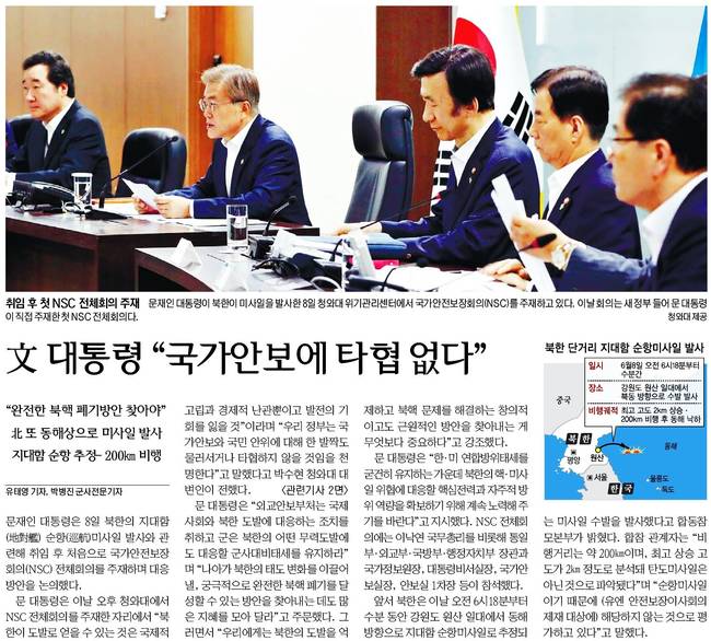 문 대통령은 이날 오후 청와대에서 NSC 전체회의를 주재한 자리에서 “북한이 도발로 얻을 수 있는 것은 국제적 고립과 경제적 난관뿐이고 발전의 기회를 잃을 것”이라며 “우리 정부는 국가안보와 국민 안위에 대해 한 발짝도 물러서거나 타협하지 않을 것임을 천명한다”고 말했다고 박수현 청와대 대변인이 전했다.