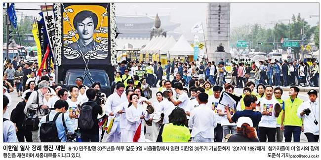 한국일보는 1987년 7월 9일, 6ㆍ10항쟁의 싸움터였던 서울시청 앞 아스팔트 길 위에서 열렸던 이한열 영결식 장면을 실었다.