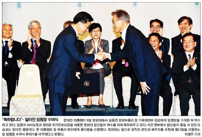국민일보는 문재인 대통령이 9일 청와대에서 김동연 경제부총리 겸 기획재정부 장관에게 임명장을 수여한 뒤 악수하고 있는 장면을 담았다.