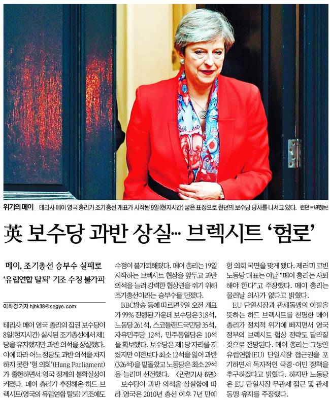 세계는 "보수당이 과반 의석을 상실함에 따라 영국은 2010년 총선 이후 7년 만에 헝 의회 국면을 맞게 됐다"며 "제러미 코빈 노동당 대표는 이날 “메이 총리는 사퇴해야 한다”고 주장했다. 메이 총리는 물러날 의사가 없다고 밝혔다"고 했다.