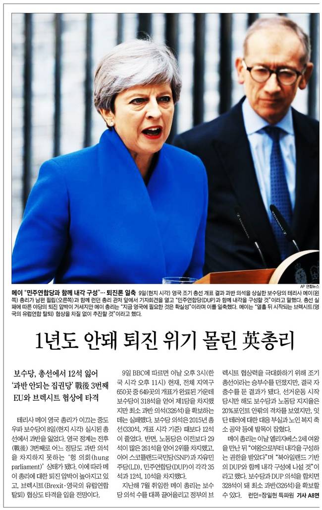 중앙일보도 9일 굳은 얼굴로 선거 결과 발표를 듣고 있는 테리사 메이 영국 총리 모습을 전했다.