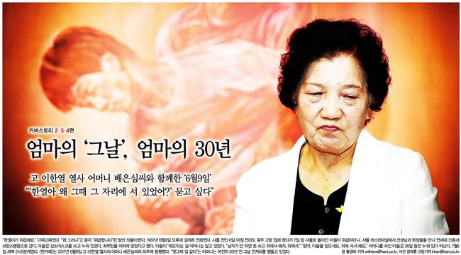 한겨레는 2017년 6월9일 고 이한열 열사의 어머니 배은심씨의 모습을 담았다. 한겨레는 관련 기사에서 "6월이 되면 가장 바빠지는 삶을 살았던 배씨의 발걸음엔 지난 30년의 모진 세월이 엉겨붙어 힘이 실렸다. 비가 내리고, 햇볕이 내리쬐는 땅 아래 내디딘 발자국 하나하나가 모두 아들을 기억하기 위한 의식이었다"고 전했다.