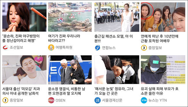 실제로 <와인 잔에 얼굴 쑥…세상 둘만 사는 ‘양자매’>, <권상우 손태영 부부, 아빠 빼닮은 아들 공개> <출근길 패션쇼 모델, 아 이분!!!>, <연예계를 떠난 후 10년만에 근황 포착된 여배우> <홍대 짜장면, 12분 만에 먹으면 공짜> 등이 지난 20일 카카오채널에서 노출된 주요 언론사 기사 제목이다.