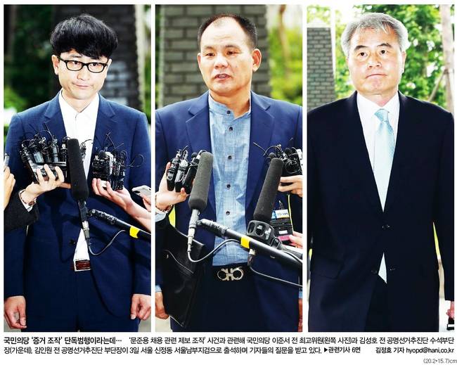 한겨레신문은 ‘문준용 채용 관련 제보 조작’ 사건과 연관된 국민의당 관계자들이 3일 서울남부지검으로 출석하며 기자들의 질문을 받는 모습을 신문 1면에 게재했다. 한겨레는 관련기사에서 “국민의당 제보 조작 사건의 ‘윗선’으로 지목되며 3일 무더기로 검찰에 소환된 이들은 모두 이유미씨의 ‘단독 범행’이라고 입을 모았다. 사건을 자체 조사한 국민의당 역시 이씨에게 허위자료를 만들라고 지시한 이도, 가짜 자료임을 사전에 인지한 이도 없었다고 밝혔다”고 보도했다.