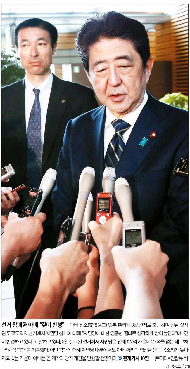 중앙일보는 아베 신조 일본 총리가 3일 관저로 출근하며 전날 실시된 도쿄도의회 선거에서 자민당패배에 대해 소감을 밝히는 모습을 전면에 내걸었다. 중앙은 사진설명에서 아베 총리가 선거와 관련해 “자민당에 대한 엄중한 질타로 받아들인다”며 “깊이 반성하고 있다”고 말했다고 전했다.