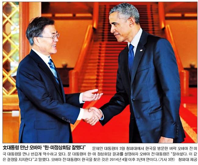 국민일보는 문재인 대통령이 3일 청와대에서 한국을 방문한 버락 오바마 전 대통령을 만나 악수하는 모습을 1면에 실었다. 국민은 사진설명에서 “문 대통령이 한미 정상회담 결과를 설명하자 오마바 전 대통령은 ‘잘 하셨다. 이 같은 결정을 지지한다’고 말했다. 오바마 전 대통령이 한국을 찾은 것은 2014년 4월 이후 3년여 만”이라고 전했다. 관련기사에선 “청와대가 3일 이례적으로 한미 정상회담에서 이뤄진 정상 간 대화를 일부 공개했다”며 “한미 자유무역협정(FTA) 재협상 등 미국의 일방적 주장이 확대 재생산되는 점을 감안한 것으로 보인다”고 했다.