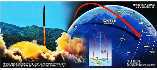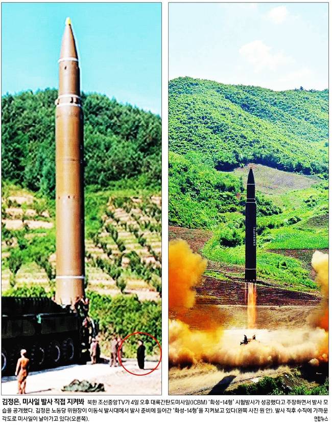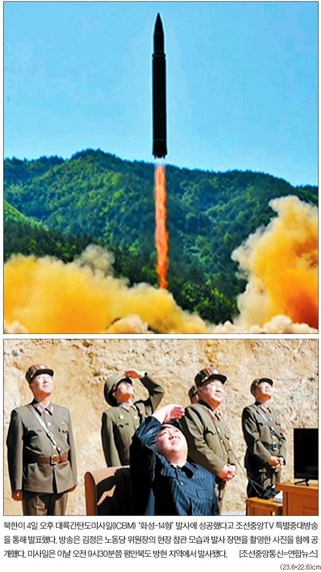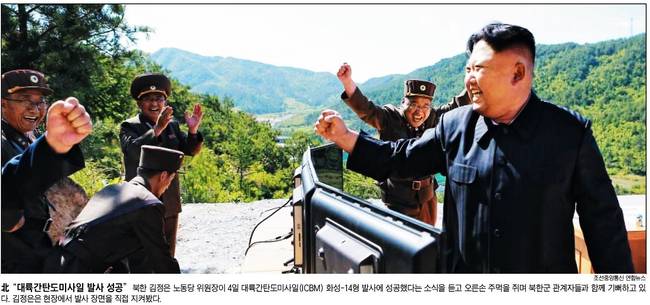 조선일보는 북한 김정은 노동당 위원장이 ICBM발사 성공 소식 후 기뻐하는 모습의 사진을 1면에 담았다. 조선은 관련기사에서 “국내외 미사일 전문가들은 북한이 밝힌 수치들을 근거로 화성-14형을 고각 발사가 아닌 30~40도 정상 각도로 발사했을 경우 6500~7000Km를 날아갈 수 있을 것으로 분석했다. 미국 본토에는 못 미치지만 알래스카 전역(6000Km)과 하와이(7000Km)는 타격할 수 있는 수준”이라고 설명했다. 조선은 또 다른 관련기사에서 “북한은 4일 북한과의 대화 재개를 연일 강조하고 있는 한국 정보를 향해 ‘(남북) 대화를 원한다면 상대가 누구인가를 똑바로 인식해야한다’며 ‘우리의 자위 억제력(핵무기)이 ’정의의 보검‘이며, 그것을 절대로 내려놓지 않으리라는 것쯤은 알고 덤벼야 하지 않겠는가’라고 했다”면서 “핵 포기를 목표로 한 대화에는 응할 의사가 없음을 분명히 한 것”이라고 보도했다.