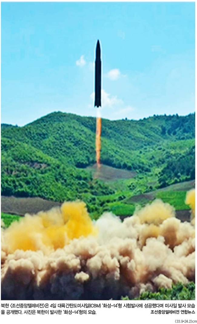동아일보는 북한이 4일 조선중앙TV를 통해 공개한 탄도미사일 화성-14형 발사 장면과 궤적 등을 함께 신문 1면에 실었다. 동아는 관련기사에서 “북한 김정은이 한미 새 대통령의 정상회담 사흘 만이자 미국 독립기념일을 즈음한 4일 대륙간탄도미사일(ICBM)의 최초 발사 성공을 선언하고 나섰다”며 “ICBM발사와 이에 탑재할 소형 핵탄두 실험 성공은 한미의 이른바 ‘레드라인(금지선)’으로 여겨져 왔다는 점에서 한반도 정세는 급격히 악화될 것으로 우려된다”고 보도했다.