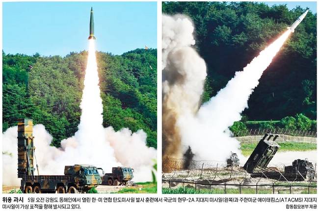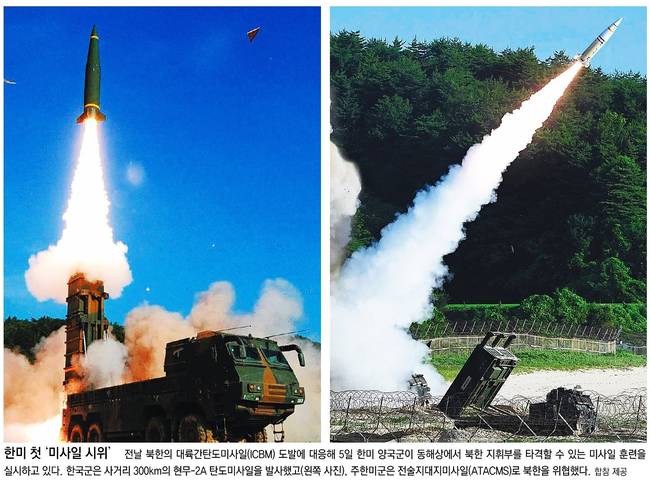 세계일보는 5일 강원도 동해안에서 열린 한미 연합 탄도미사일 발사 훈련에서 국군의 현무-2A 지대지 미사일과 주한미군 에이태킴스 지대지 미사일이 가상 표적을 향해 발사되는 모습을 나란히 배치해 1면에 내걸었다. 세계는 관련기사에서 “문재인 대통령 지시에 따라 한미 양국군이 5일 오전 북한의 대륙간탄도미사일(ICBM) 시험발사에 맞서 사상 처음으로 탄도미사일 발사훈련을 실시했다”며 이와 관련한 문 대통령과 트럼프 미국 대통령의 발언을 전했다.