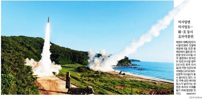 한미 당국이 5일 탄도미사일로 북한의 지휘부를 타격하는 훈련을 하고 이를 공개했다. 더 이상 도발을 좌시하지 않겠다는 분명한 메시지를 북측에 전달한 것으로 보인다. 남북관계 개선을 희망하며 북한을 대화의 장으로 끌어내고자 했던 문재인 대통령이 직접 ICBM 도발에 무력시위를 지시하면서 여러 변화가 예상된다. 6일 대부분의 주요 일간지들은 이 같은 소식과 관련한 사진을 신문 1면에 내걸었다.