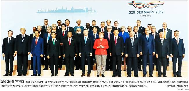 경향신문은 G20 정상들이 독일 함부르크에서 7일 개막한 주요 20개국 정상회의에서 정상들이 함께 찍은 단체사진을 신문 전면에 내걸었다. 경향은 관련기사에서 “한·미·일 정상이 7일 북한의 대륙간탄도미사일(ICBM) 발사 성공 발표에 대해 보다 강력한 유엔 안전보장이사회 결의를 신속하게 도출해 이전보다 훨씬 강화된 압박을 가하는 것이 중요하다는 데 의견을 같이 했다”면서 “중국과 러시아에는 안보리 대북 제재 결의를 철저히 이행하고, 대북 압박에 더 박차를 가해줄 것을 촉구했다”고 보도했다.