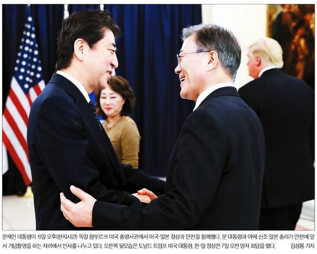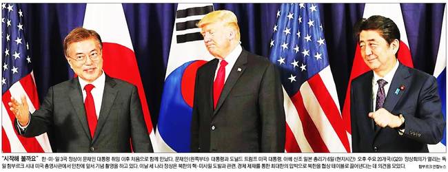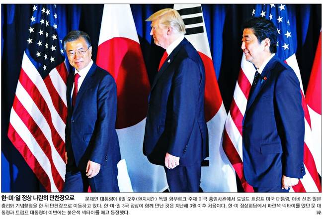 조선일보도 같은 사진을 1면에 사용했다. 조선은 관련기사에서 “문재인 대통령이 북핵 문제 해결을 위해 한·미·일 안보 공조를 강화하고 있다”며 “과거 진보 정부에서 중국을 의식해 한·미·일 삼각동맹 구도가 부각되는 것을 피했던 것과 다른 모습”이라고 전했다. 이어 “시진핑 중국 국가주석이 정상회담에서 한·미·일 협력 구도에 우려를 표했지만, 문 대통령은 ‘이런 상황에서는 불가피하다’고도 한 것으로 7일 알려졌다”고 게재했다.