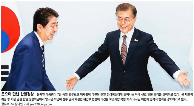 동아일보는 7일 G20 현장에서 문재인 대통령이 아베 총리를 맞이하는 모습을 1면에 걸었다. 동아는 관련기사에서 “문재인 대통령은 7일 독일 함부르크에서 아베 신조 일본 총리와 정상회담을 갖고 한일 정상 간 셔틀외교(정상 간 상호방문)를 복원하기로 했다”며 “다만 문 대통령은 한일 위안부 합의를 두고 ‘국민 대다수가 (합의를)정서적으로 수용하지 못하는 현실일 인정하면서 양국이 공동으로 노력해 해결해 나가야 한다’고 했다”고 보도했다. 동아는 또 다른 관련기사에서 “4일 북한의 대륙간탄도미사일(ICBM)급 미사일 발사 전후로 펼쳐진 외교전에서 ‘한·미·일(한국 미국 일본) 대 북-중-러(북한 중국 러시아)’의 전선이 명확하게 그어지고 있다”고 게재했다.