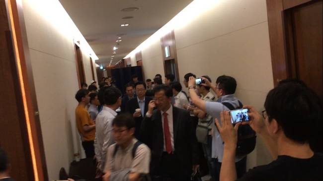 ▲공영방송 KBS의 노동조합과 사내 직능단체들로 구성된 '고대영, 이인호 퇴진을 위한 KBS비상대책위원회'는 27일 서울 마포구 가든호텔을 찾아 고대영 사장의 신임 부사장 임명에 항의의 뜻을 밝혔다. 사진은 이날 임시이사회에 참석하는 이사들과 항의하는 구성원들의 모습.