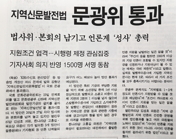“‘KBS수신료 분리법안’ 등 방송법 개정안 처리 문제에 발목 잡혔던 ‘지역신문발전지원특별법’이 국회 문화관광위원회에서 통과됐다. 이 법안은 각각 법사위와 본회의를 남겨 놓고 있지만 열린우리당 김성호 의원, 한나라당 고흥길·목요상 의원이 각각 발의한 3개 법안이 절충된 데다 기자협회 등 언론 단체들의 요구가 어느 때보다 높아 법안 통과가 예상된다.”