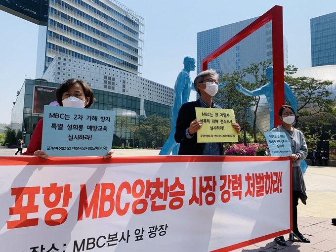 포항여성회는 20일 서울 마포구 상암동 MBC 본사 앞 광장에서 기자회견을 열어 “피해자 보호 조치를 무시한 채 2차 가해를 하고, 사건 발생 후 두 달이 된 시점에 뒤늦게 사태 수습에 나선 양찬승 사장에 대해 MBC 차원에서 강력한 처벌을 해야 한다”고 밝혔다.
