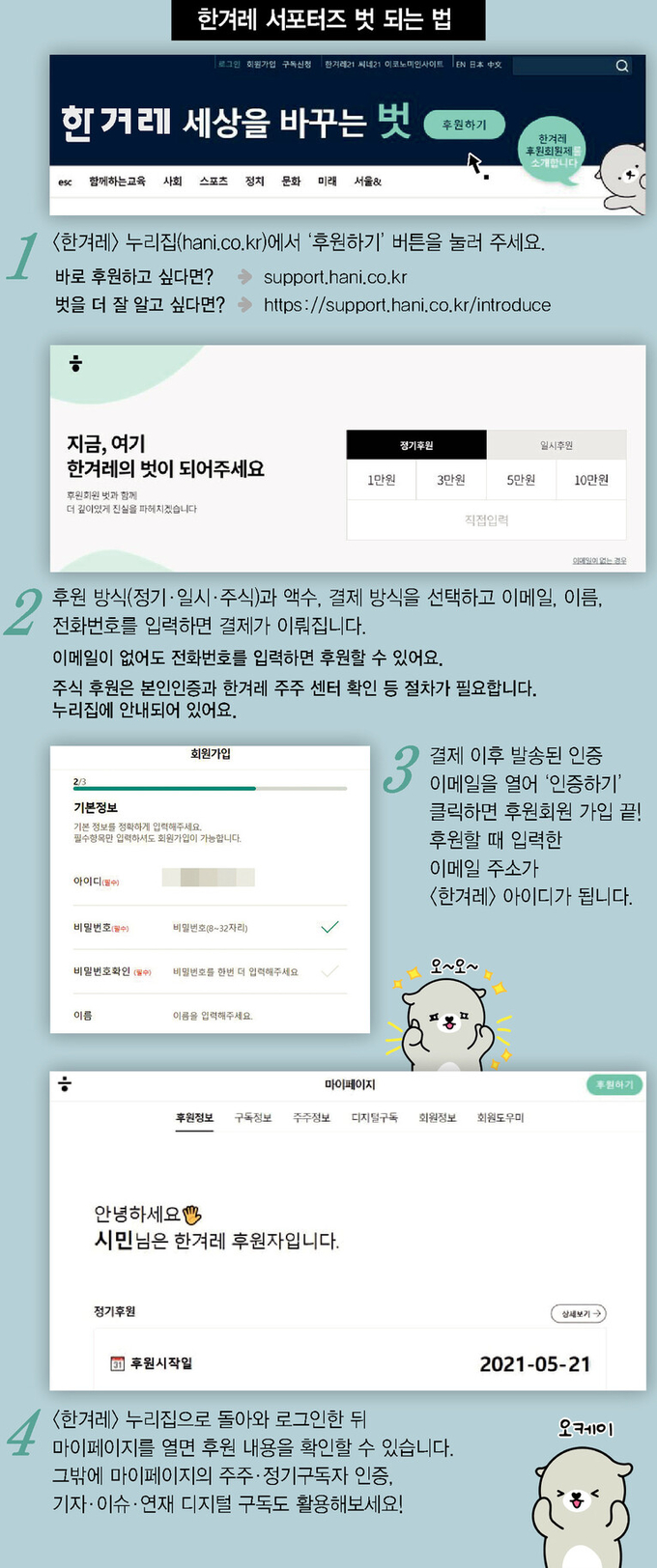 한겨레 서포터즈 '벗'이 되려면 한겨레 홈페이지 상단의 ‘후원하기’ 버튼을 누르면 된다. 방식은 정기 후원, 일시 후원, 주식 후원으로 나뉘어 있는데, 자신이 정한 금액을 매달 정기로 후원하거나 한번에 일시 후원할 수 있다.