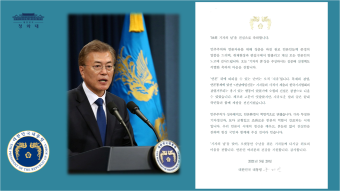 또한 문 대통령은 한국기자협회가 지난 5월20일 서울 중구 한국프레스센터에서 개최한 제16회 ‘기자의 날’ 기념식에 보낸 축전을 통해 “민주주의와 언론자유를 위해 청춘을 바친 원로 언론인들께 존경의 말씀을 드리며 취재 현장과 편집국에서 땀 흘리고 계신 모든 언론인의 노고에 감사드린다”며 “언론 뒤에 따라올 수 있는 단어는 오직 자유다. 독재와 검열 언론 통제에 맞선 전남매일신문 기자들의 사직서 제출과 한국기자협회의 검열거부라는 용기있는 행동이 있었기에 오월의 진실은 광장으로 나올 수 있었다”고 했다.
