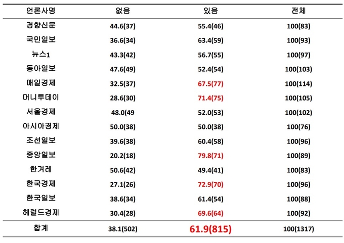 먼저 제목에선 전체 기사 1317건 중 절반 이상인 61.9%(815건)가 타블로이드적 성격을 지닌 것으로 나타났다. 기사 제목에 선정적이거나 성적인 내용을 포함했는지, 과장된 표현이나 느낌표 등 과도한 문장 부호를 이용했는지 등을 분석한 결과다. 언론사별로는 중앙일보가 79.8%로 가장 많았고, 한국경제신문(72.9%), 머니투데이(71.4%) 등의 순이었다.