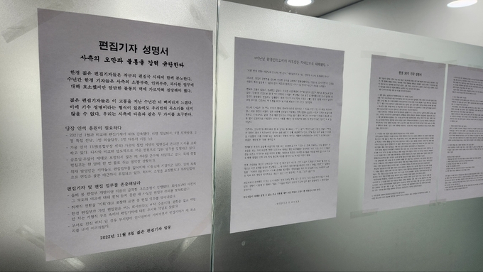 한경 사측은 8일 오후 5시30분 기수별 1인 이상 기자들이 참석한 가운데 ‘사장과의 대화’를 진행할 예정이다. 사측은 이번 사태에 대해 “회사 구성원들의 의견을 경청해 미흡했던 부분을 점검하고 업무 과중 문제 등을 적극 개선해 나갈 계획”이라고 밝혔다.