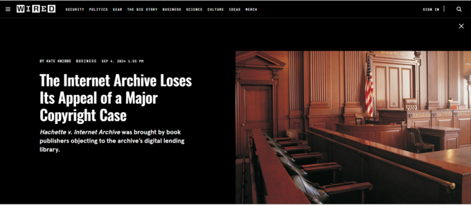 영미권 디지털 문화 전문매체 와이어드(Wired)는 최근 ‘인터넷 아카이브 주요 저작권 소송 항소심에서 패소(The Internet Archive loses its appeal of a major copyright case)’ 기사를 통해 “항소법원이 인터넷 아카이브의 도서 디지털화 프로젝트 중 하나가 저작권법을 위반했다는 ‘아셰트 대 인터넷 아카이브(Hachette v. Internet Archive)’의 이전 판결을 유지했다”고 전했다. 기사는 항소법원이 “특정 상황에서 저작권 침해를 허용하는 공정 사용 원칙에 의해 대출 관행이 보호된다는 인터넷 아카이브 측 주장을 ‘설득력이 없다’며 배척했다”고도 부연했다.