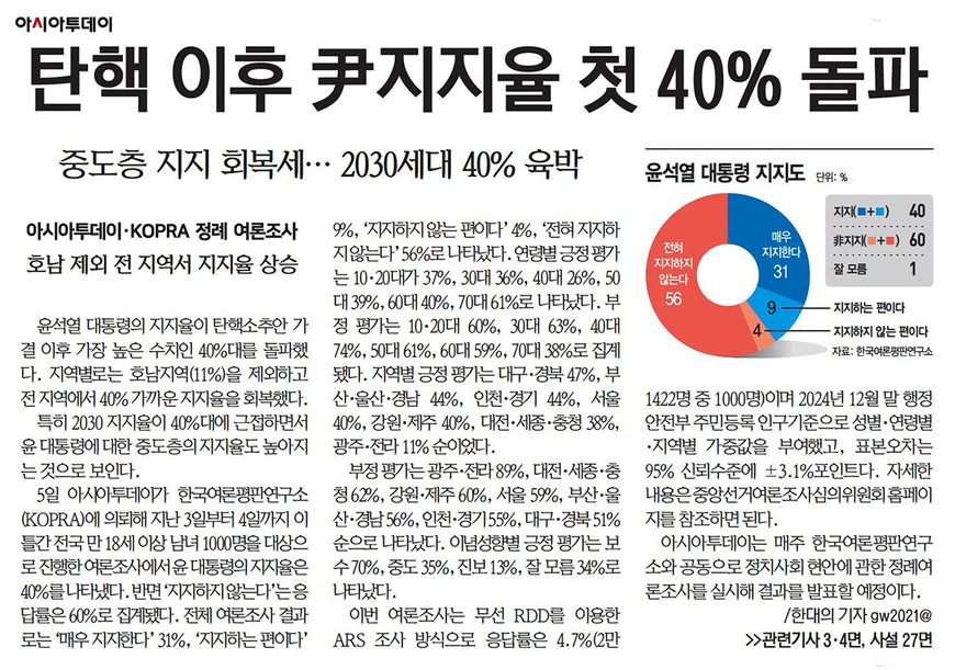 발단이 된 건 아시아투데이가 5일 내놓은 조사 결과였다. 아시아투데이는 한국여론평판연구소(KOPRA)에 의뢰, 전국 만 18세 이상 남녀 1000명을 대상으로 진행한 여론조사(응답률 4.7%)에서 윤 대통령의 지지율이 40%를 넘었으며, 특히 2030 지지율이 40%에 근접했다고 보도했다. 곧장 이를 인용한 보도가 포털에 쏟아졌다. ‘달라진 여론’, ‘기적이 일어나고 있다’, ‘자유민주주의자의 염원’ 등의 표현이 헤드라인에 등장했다.