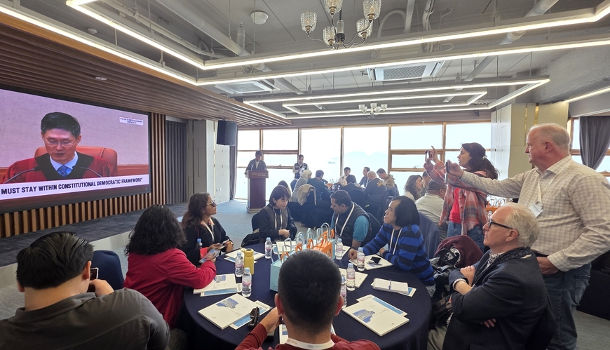 ‘2025 세계기자대회’ 참가를 위해 52개국에서 온 62명의 기자들은 행사 닷새째인 이날, 다 함께 헌법재판소의 탄핵심판 선고 생중계를 지켜봤다. 선고 시작 전 경기 시흥시 시화호를 견학하며 유튜브로 생중계를 보던 기자들은 시흥시가 오찬장에서 아리랑국제방송을 틀어주자 곧장 집중해 방송을 시청했다. 일부 기자들은 사진과 영상으로 관련 장면을 촬영했고, 한국의 상황을 미처 몰랐던 기자들은 다른 관계자들에 관련 정보를 물어보기도 했다.