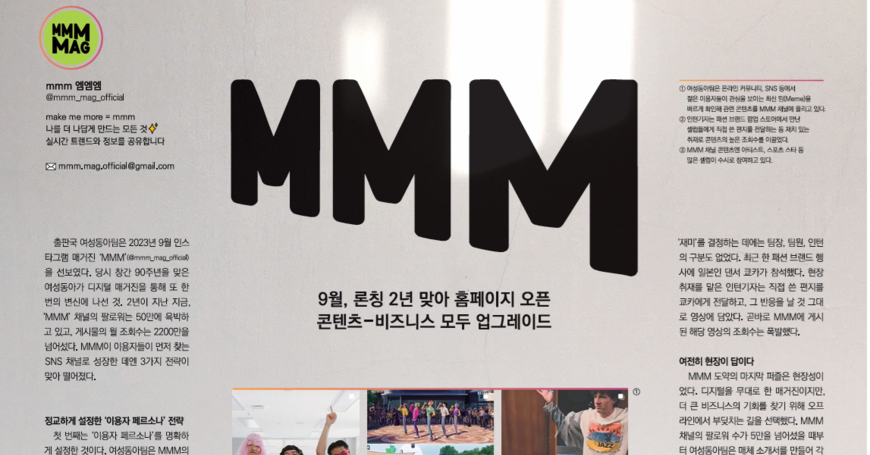 여성동아를 발행하는 동아일보 출판국 여성동아팀이 인스타그램 매거진 ‘MMM(엠엠엠)’을 론칭하고 2년 만에 50만에 가까운 팔로워를 기록하며 유의미한 성과를 내고 있다. 기성 매체가 MZ세대, 특히 사회 초년생 여성을 겨냥하고, 트렌드가 생명인 영역에서 이만큼 성과에 도달했다는 점에서 드문 사례다. (관련 기사: <동아미디어그룹, MZ 타깃 '인스타', '틱톡' 콘텐츠 성과>)