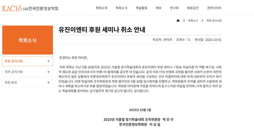성명에 적시된 소위 언론 3학회 중 언론정보학회는 비판 성명 이후 유진이엔티 후원 세미나를 취소한다고 공지했다. 언론정보학회는 1일 공지에서 “YTN 민영화 과정을 둘러싼 사회적 논란이 여전히 해소되지 않은 상황에서 언론정보학회가 유진이엔티 후원의 세션을 구성하는 것이 적절한지에 대한 학계 내외부의 우려가 제기됐다”며 “학술대회 조직위원장과 학회 총무단은 9월30일 임시회의를 진행하고, 학회원들의 우려를 겸허히 수용하여 세미나 계획을 취소하기로 최종 결정했다”고 밝혔다.