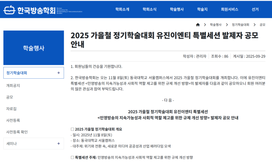 2일 전국언론노동조합 YTN지부에 따르면 이날 방송학회는 2025년 가을철 정기학술대회 조직위원장과 학회장 명의의 문자메시지를 통해 학회원들에게 해당 세션을 취소한다고 전했다. 방송학회는 “유진이엔티 후원 특별세션 개최에 대한 문제가 있다는 의견이 안팎으로 다수 제기된 바, 학회 집행부와 조직위원회의 논의를 거쳐 해당 세션을 취소하기로 결정하였음을 알려드린다”고 밝혔다. 이에 따라 9월29일 공지했던 이 세션 발제자 공모 절차 역시 취소됐다고 전했다.