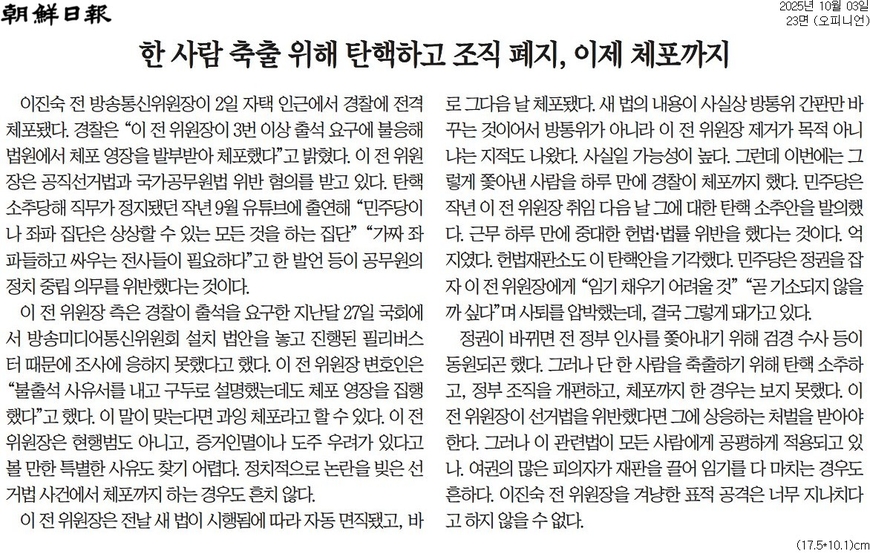 조선일보는 <한 사람 축출 위해 탄핵하고 조직 폐지, 이제 체포까지> 제하의 사설에서 “정권이 바뀌면 전 정부 인사를 쫓아내기 위해 검경 수사 등이 동원되곤 했다. 그러나 단 한 사람을 축출하기 위해 탄핵 소추하고, 정부 조직을 개편하고, 체포까지 한 경우는 보지 못했다”면서 “이진숙 전 위원장을 겨냥한 표적 공격은 너무 지나치다고 하지 않을 수 없다”고 했다.