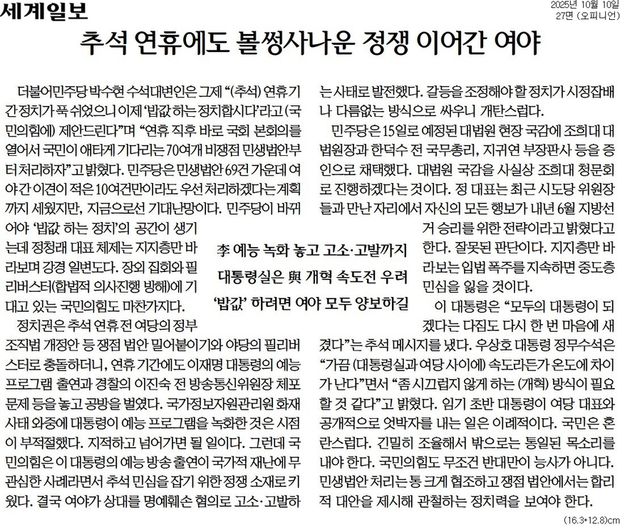 세계일보도 10일자 사설 ‘추석 연휴에도 볼썽사나운 정쟁 이어간 여야’를 통해 정치권의 행보를 비판했다. 국민일보는 “정치권은 추석 연휴 전 여당의 정부조직법 개정안 등 쟁점 법안 밀어붙이기와 야당의 필리버스터로 충돌하더니, 연휴 기간에도 이재명 대통령의 예능 프로그램 출연과 경찰의 이진숙 전 방송통신위원장 체포 문제 등을 놓고 공방을 벌였다”고 했다.