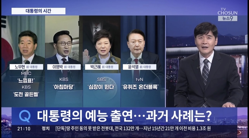 역대 대통령이 예능 프로그램 등에 출연할 때마다 정치적 국면이나 당시 상황과 맞물려 논란은 반복돼왔다. 노무현 전 대통령은 2003년 MBC 예능 ‘느낌표’, 2005년 KBS ‘도전!골든벨’에 출연했다. 2008년엔 이명박 전 대통령이 KBS ‘아침마당’ 추석 특집 편에, 2013년 박근혜 전 대통령이 SBS ‘심장이 뛴다’에 출연한 바 있다. 당시엔 방송 출연을 두고 이미지 정치란 지적과 더불어 자기 홍보, 국정 홍보에 방송을 동원했다는 비판이 나왔다. 특히 2022년 윤석열 전 대통령은 당선인 시절 tvN 예능 ‘유퀴즈 온 더 블록’에 나왔는데 대통령실이 무리한 추진을 했다며 외압 논란이 불거지기도 했다.