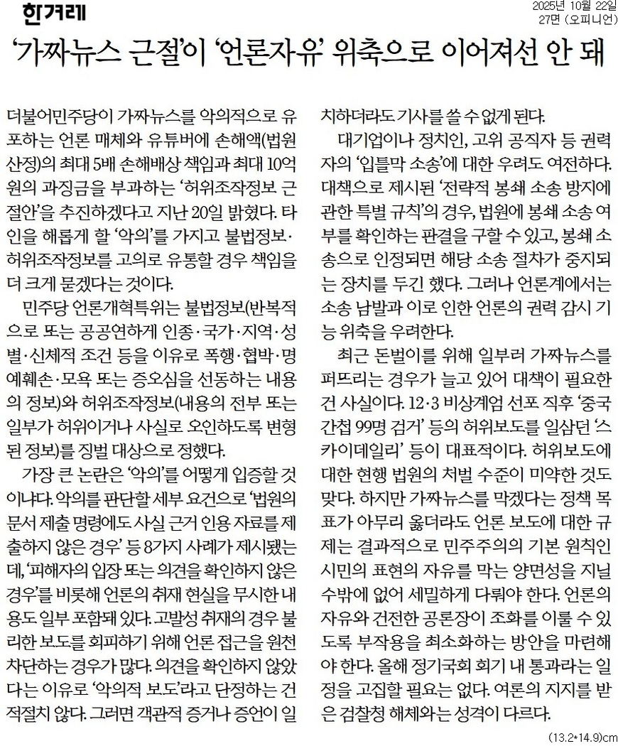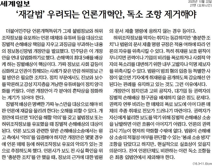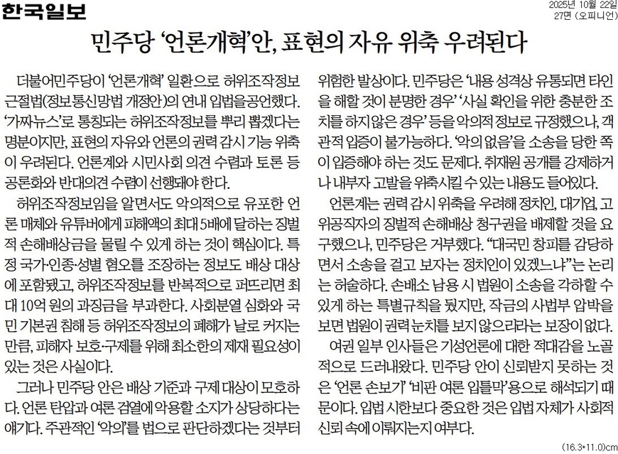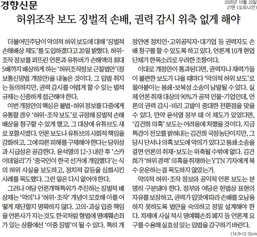 22일자 다수 주요 신문사 사설에선 민주당의 망법에 대한 우려가 잇따랐다. 경향신문은 이날 <허위조작 보도 징벌적 손배, 권력 감시 위축 없게 해야> 사설을 통해 “언론 보도나 유튜브의 사회적 책임을 강화하고, 그에 따른 피해를 구제해야 한다는 당위성과 시급성은 공감한다”면서 “윤석열의 12·3 내란 후 ‘스카이데일리’가 ‘중국인이 한국 선거에 개입했다’는 식의 허위 사실을 보도하고, 정치적 갈등을 심화시킨 사례를 목도했다. 그런 일은 다시 없어야 한다”고 했다.