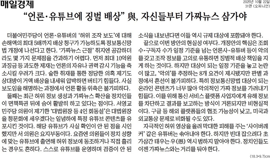 매일경제는 이날 <“언론·유튜브에 징벌 배상” 與, 자신들부터 가짜뉴스 삼가야> 사설을 통해 “허위 정보 생성과 가짜뉴스 확산을 정치인들이 면책특권 뒤에 숨어 활발히 하고 있다”며 “요즘엔 의원들이 정치성향에 맞는 유튜브에 출연해 허위 정보에 동조하거나 직접 흘리는 경우도 흔하다. 스스로 유튜브를 운영하며 검증이 안 된 소식을 내보낸다면 이들 역시 규제 대상에 포함돼야 한다”고 했다.