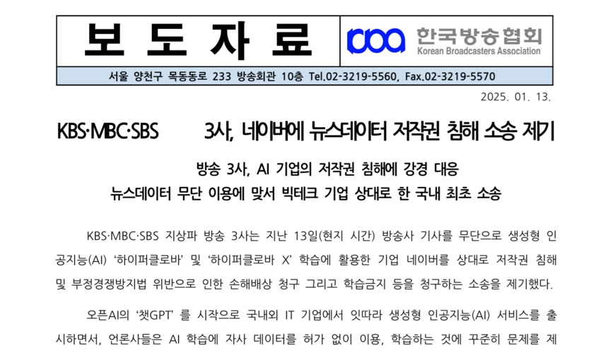 네이버가 자사 기사를 무단으로 생성형 인공지능(AI) 학습 데이터로 활용했다며 KBS, MBC, SBS 등 지상파 3사가 제기한 저작권 침해 민사소송에서 ‘침해 대상이 된 개별 저작물’ 사례가 핵심 쟁점이 되고 있다. AI 학습 데이터 관련 방송사-네이버 간 정보 비대칭에 따른 입증의 어려움, 여타 ‘약관’이나 ‘공정이용’ 등 쟁점을 종합적으로 고려할 때 언론사에 좋은 시그널로 보긴 어려운 상황이다.