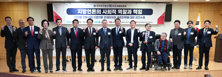 경인일보가 창간 80주년을 맞아 ‘지역언론의 사회적 역할과 책임’을 돌아보는 토론회를 11일 국회 의원회관에서 열었다. 경인일보가 주관하고 김승원 더불어민주당 의원, 송석준 국민의힘 의원이 공동 주최한 이날 토론회엔 홍정표 대표이사 사장과 조영상 편집국장을 비롯한 경인일보 임직원, 여야 국회의원, 언론계와 학계, 경기지역 지방자치단체 관계자 등 100여명이 참석해 성황을 이뤘다.