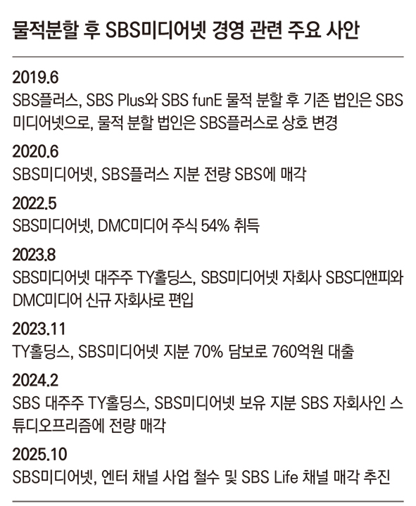 SBS미디어넷의 위기는 앞서 2019년부터 시작됐다. 당시 SBS미디어넷의 지주사인 TY홀딩스는 드라마채널 SBS Plus와 예능채널 SBS funE를 물적 분할했고, 핵심 수익채널을 잃은 회사는 즉각적인 수지 악화를 겪었다. 특히 태영건설의 경영위기가 본격화된 2023년부턴 SBS미디어넷이 대주주의 ‘돈줄’ 역할로 전락하며 구성원들 우려를 샀다. 그해 분할 합병과 담보 대출 등으로 태영건설 위기를 함께 떠안은 SBS미디어넷은 지난해 2월 TY홀딩스가 보유 지분 전량을 스튜디오프리즘에 매각하며 SBS의 손자회사가 됐다.