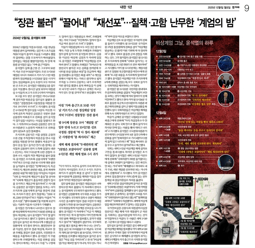 비상계엄 선포 당일 윤석열 전 대통령의 행적을 추적한 기획도 나왔다. 한겨레신문은 1일자 5면 <2024년 12월3일, 윤석열의 하루>에서 그날 아침 8시52분 ‘가짜 출근’으로 50분 지각한 윤 전 대통령이 다음날 새벽 5시께 귀가하기까지 숨가빴던 하루를 담았다. 낮에 키르키스스탄 대통령과 정상회담을 하고 저녁 7시부터 경찰청장과 장관들을 불러 계엄군에 협조를 지시하고 밤 10시27분 계엄을 선포한 뒤 국회로 출동한 군과 경찰을 지휘하며 “총을 싸서라도 문을 부수고 들어가서 끌어내”라고 채근하고 국회가 새벽 1시3분 비상계엄 해제 결의요구안을 통과시키자 김용현 국방부 장관을 질책하고 새벽 4시27분 비상계엄 해제를 발표하고 귀가한 ‘계엄의 밤’이 그려진다.