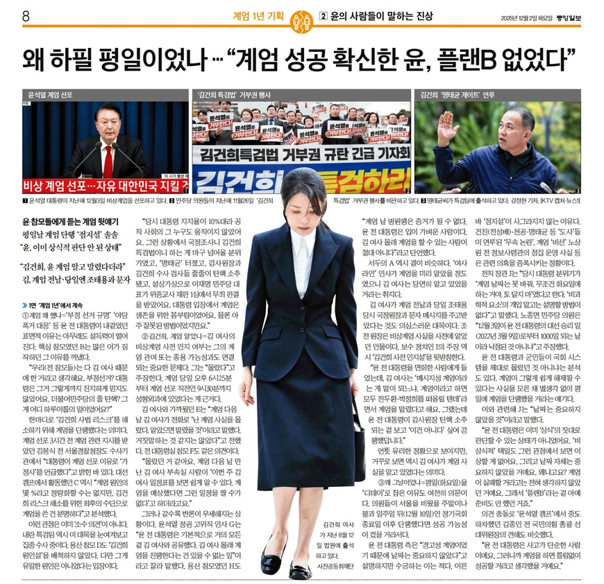중앙일보가 2일 보도한 <윤의 사람들이 말하는 계엄 진상>은 계엄을 둘러싼 3대 의문에 주목했다. ‘실록 윤석열 시대’ 취재팀은 윤석열 정부의 참모, 각료, 대선 캠프 관계자, 이른바 ‘여사 라인’ 및 ‘비선 인사’ 등 수십 명을 만나 들은 이야기를 토대로 △윤 전 대통령이 왜 계엄을 단행했는지 △김건희 여사가 사전에 계엄을 알았는지 △평일을 ‘디데이’로 잡은 이유 등을 파고들었다. 동아일보는 1일 <계엄 1년, 끝나지 않은 그림자> 기획 1편 ‘드러난 진실과 남은 퍼즐’에서 검찰 비상계엄 특별수사본부와 내란 특검이 재판에 넘긴 계엄 관련 주요 피고인 23명의 공소장을 분석해 비상대권을 처음 언급한 2022년 11월부터 계엄 나흘 전인 11월29일 포고령, 담화문 등을 준비하고 계엄을 선포하고 해제하기까지 과정을 꼼꼼히 짚었다.